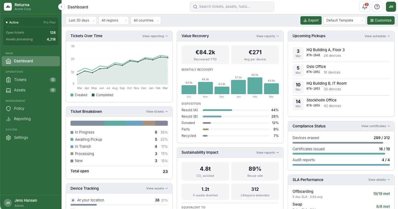 Track every device, across every region, from a single dashboard. Real-time visibility into recovery value, ticket status, and hub performance - whether you operate in one country or thirty.