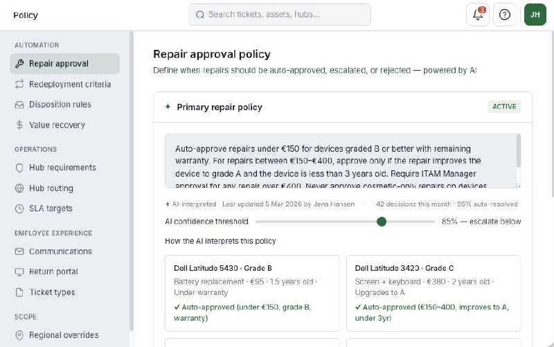 Define disposition rules, repair thresholds, redeployment criteria, and value recovery policies - then let AI agentic workflows execute them across every vendor. Manual work reduced to an absolute minimum.
